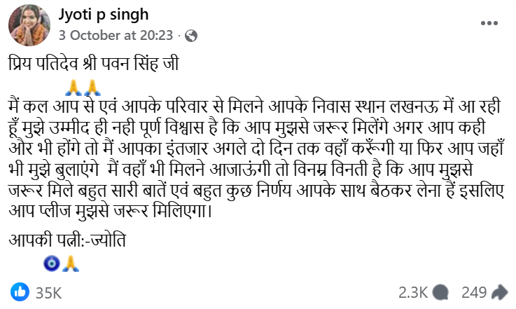 सोशल मीडिया पर पहले ही कर दिया था ऐलान ज्योति सिंह ने 3 अक्टूबर को सोशल मीडिया पर लिखा था- मैं लखनऊ आ रही हूं, आपसे मिलने का इंतजार करूंगी। इस पोस्ट के बाद से ही उनके प्रशंसकों और मीडिया में चर्चा तेज थी कि वह सचमुच पवन सिंह से मिलने जाएंगी या नहीं। रविवार को वह लखनऊ पहुंचीं और सीधे उनके फ्लैट पर चली गईं।