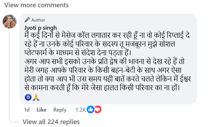 ज्योति कहती हैं- नमस्कार मैं हूं ज्योति सिंह और मैं आ चुकी हूं लखनऊ में पवन सिंह के घर पर। पवन जी ने हमारे लिए पुलिस थाने में FIR किया है। और मुझे लेने के लिए पुलिस के जवान आए हुए हैं। उन्होंने चेतावनी देते हुए कहा- मैं इतना परेशान हो चुकी हूं कि जहर खाकर मर जाऊंगी। अब इस घर से मेरी लाश निकलेगी।